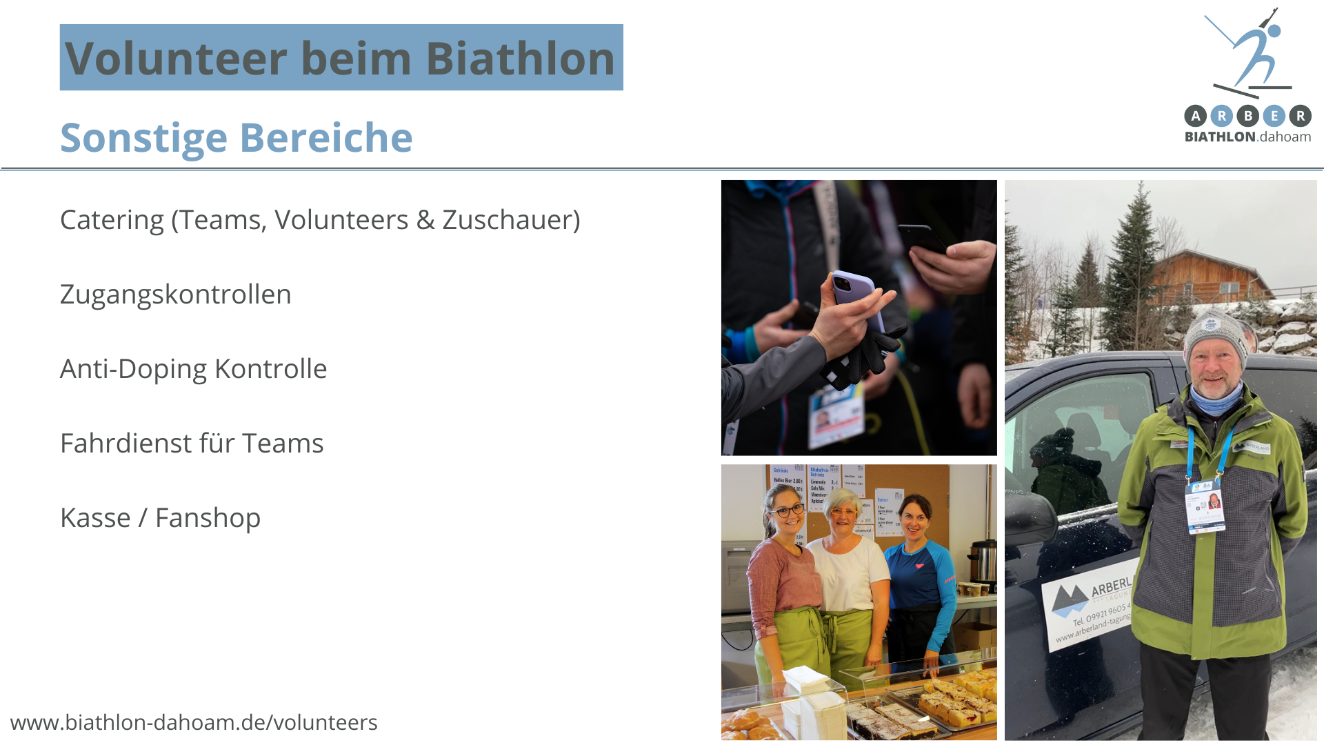 Unsere Volunteers sind Ansprechpartner für Sportler, Funktionäre, Zuschauer, Medienvertreter und verkörpern die bayerische Gastfreundschaft. Ohne sie wäre ein solches Event schlichtweg nicht zu stemmen. Ihre Aufgaben sind vielfältig und reichen vom Auf- und Abbau, über Wettkampfbetreuung, Einlasskontrollen und Information bis hin zum Shuttleservice. In verschiedene Bereiche suchen wir nach engagierten Helfern mit Teamgeist und Motivation.